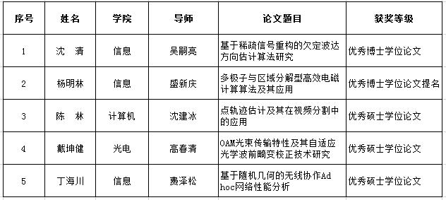 2016年9月收到中国电子学会通知后,研究生院高度重视,积极组织各学院进行申报,在各学院及导师、研究生的共同努力下,最终我校2名博士生、3名硕士生获得优秀学位论文奖,获奖总篇数与上海交通大学、电子科技大学、北京邮电大学并列位居全国高校第二名(清华大学位居第一名)。特向五位教授和研究生表示祝贺,并希望全校广大师生以此为榜样,坚持科学严谨的学风和勇攀高峰的精神,再接再厉,取得更多优异成绩。