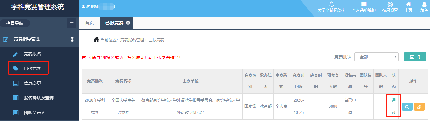 已报名2021年全国大学生英语竞赛(A类)的研究生可登录学科竞赛管理系统http://xkjs.cnpigeon.com/“已报竞赛”模块查看报名结果,状态为“通过”表示报名成功。