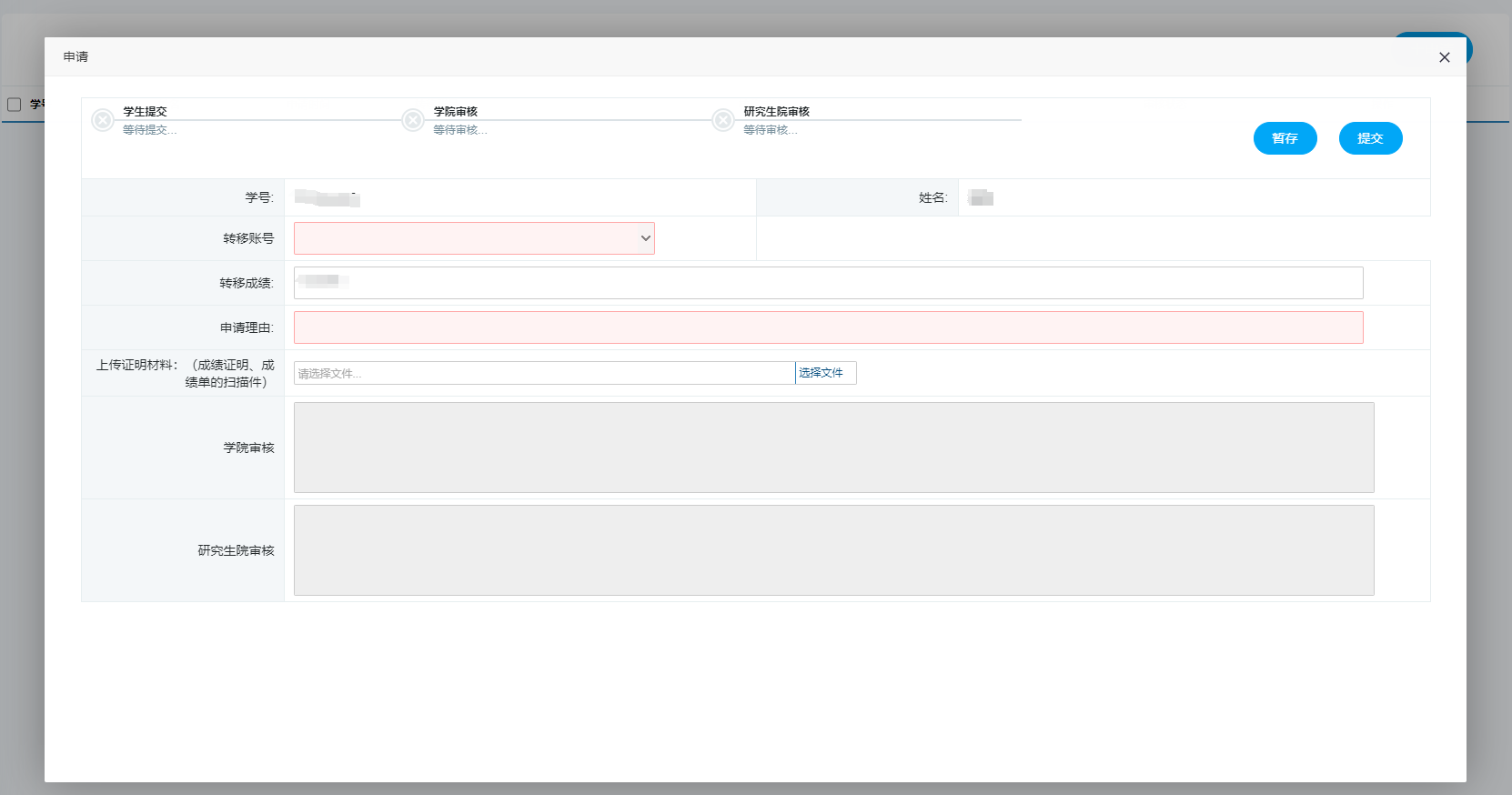 转移账号为博士学号,填写申请理由,并上传相关证明材料(如:成绩证明、成绩单等扫描件),提交前可暂存,确认无误后点击“提交”按钮。(如下图)