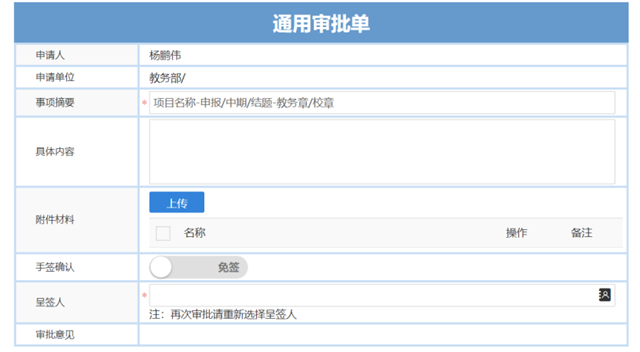 在通用审批单界面,按实际情况填写项目摘要(项目名称+申报书/合作协议/中期报告/结题报告+盖教务章/盖研究生院章),在具体内容中填写简要项目及合作情况,并上传申报书,呈签学院本科教学院长/学院研究生教学院长。教学院长审批通过后,项目负责人可线上传阅教务部/研究生院联系人,并发送电子版申报书至联系人邮箱。