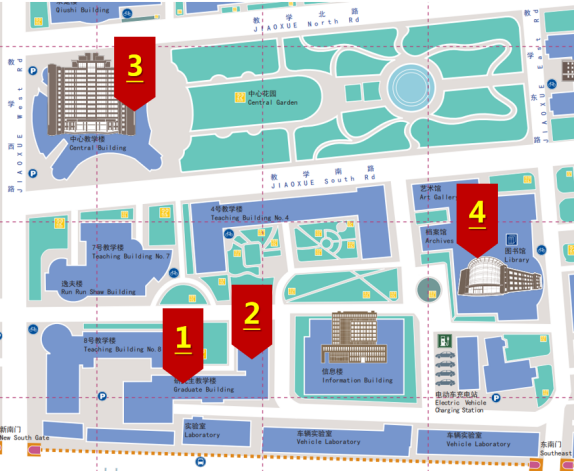 西北区:学生服务中心一层大厅;东北区:文萃楼K栋一层大厅;西南区:理科教学楼B口;东南区:图书馆一层大厅