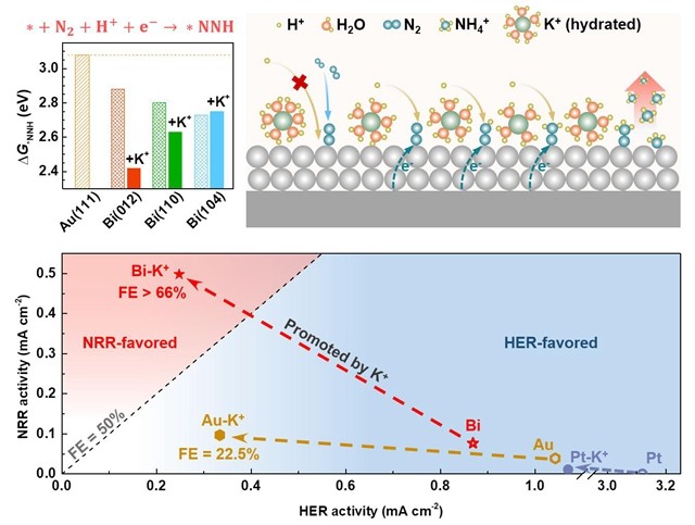 图1. Bi–K+催化体系实现高效电化学合成氨:理论模拟,反应模型与催化性能